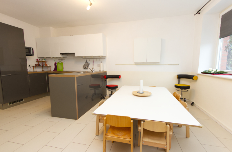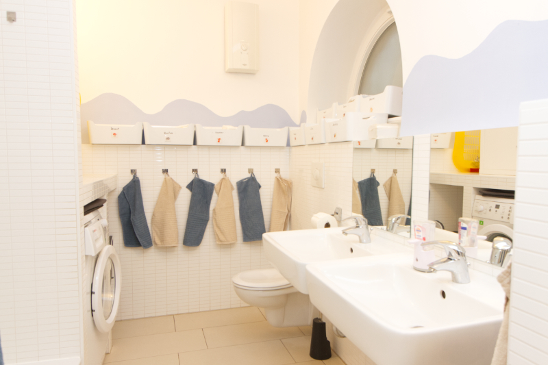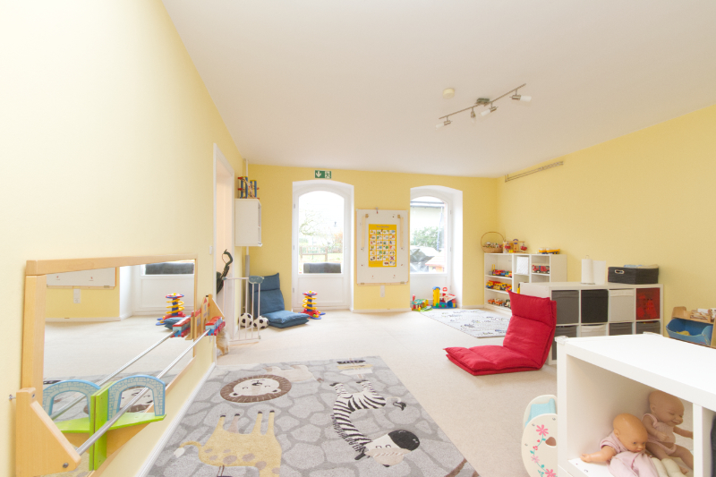 Die Fußböden haben bewußt verschiedenen Beläge: Teppich, Leufer und Linoleum für die verbesserte Wahrnehmung Natürlich gibt es auch Tische und Bänke / Stühle in der richtigen Größe für die Kinder, die zum Malen und Basteln einladen „den Kreativbereich“. Es gibt noch ein Rollenspiel-, ein Mathematik-, ein Musik-, und einen Naturwissenschaftlichen Bereich, ein Bau-. sowie Kuschel- und Leseecke. Jedes Kind bekommt eine Schatzkiste die mit seinem Namen und Bild versehen ist. In dieser Kiste können Kinder ihre Schätze (Gebasteltes, Mitgebrachtes….) legen. In die selbige bekommt auch jedes Kind ein selbst gebasteltes „Ich Buch“, das besteht aus den Bildern: Ich (das Kind) Mama, Papa, Geschwister, Familie, und was dem kind wichtig ist.