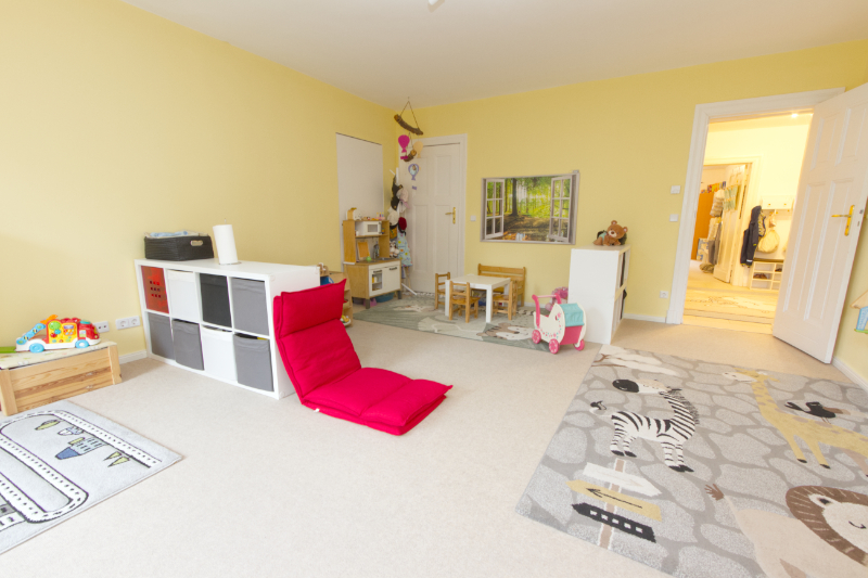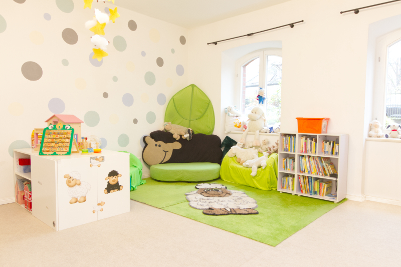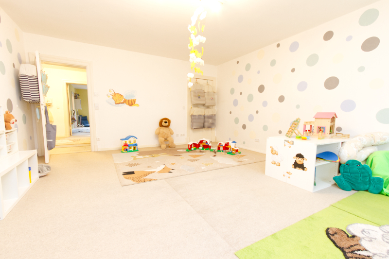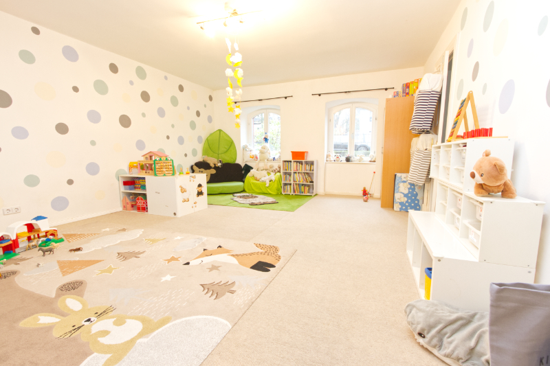 Die Kinder haben zwei Zimmer, welche zum Spielen und Wohlfühlen einladen. Ich habe bewusst warme Farben gewählt, welche das Wohlbefinden der Kinder unterstützt. In den Zimmern befinden sich Regale und Spielkisten, die in verschiedenen Bereichen aufgeteilt sind, aus denen sich die Kinder selbst bedienen können. Die Kisten sind beschriftet und mit den entsprechenden Symbolen versehen. Somit weiß jedes Kind, was in der Kiste ist. Das unterstützt das spätere wiedererkennen der Buchstaben. und die Kinder lesen anhand der Symbole stolz vor, was sich in der Kiste befindet.